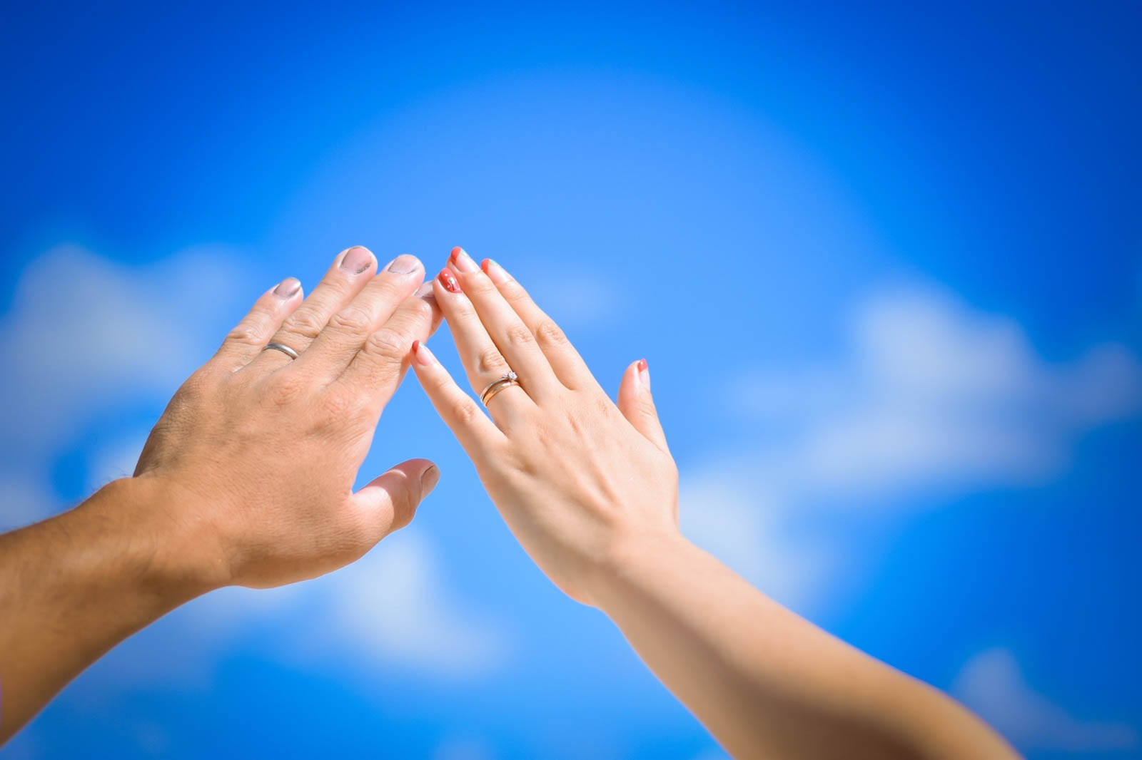 青い空や海へ伸ばした手に誓いのリングが光ります。お二人の希望あふれる未来を想像させる一枚ですね。ナチュラル感も素敵です。