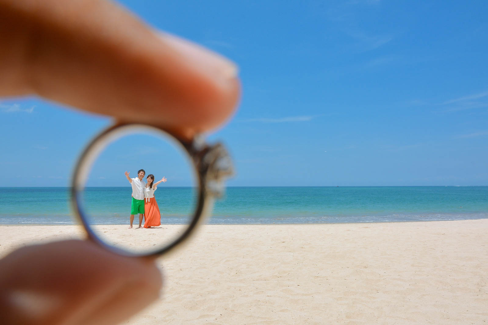 絶対に記念になる、ちょっと面白いショットに挑戦してみたい方へ。カメラマンが遠近法のテクニックを使って、キラキラの指輪をフレームにしてしまいますよ。