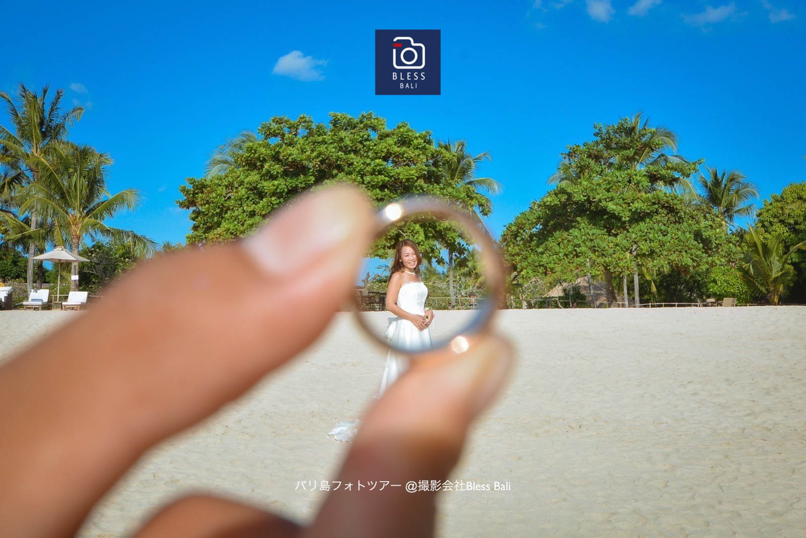 特にビーチフォトやサンセットの時間帯は、指輪がやさしく輝き、バリ島らしい一枚になります。