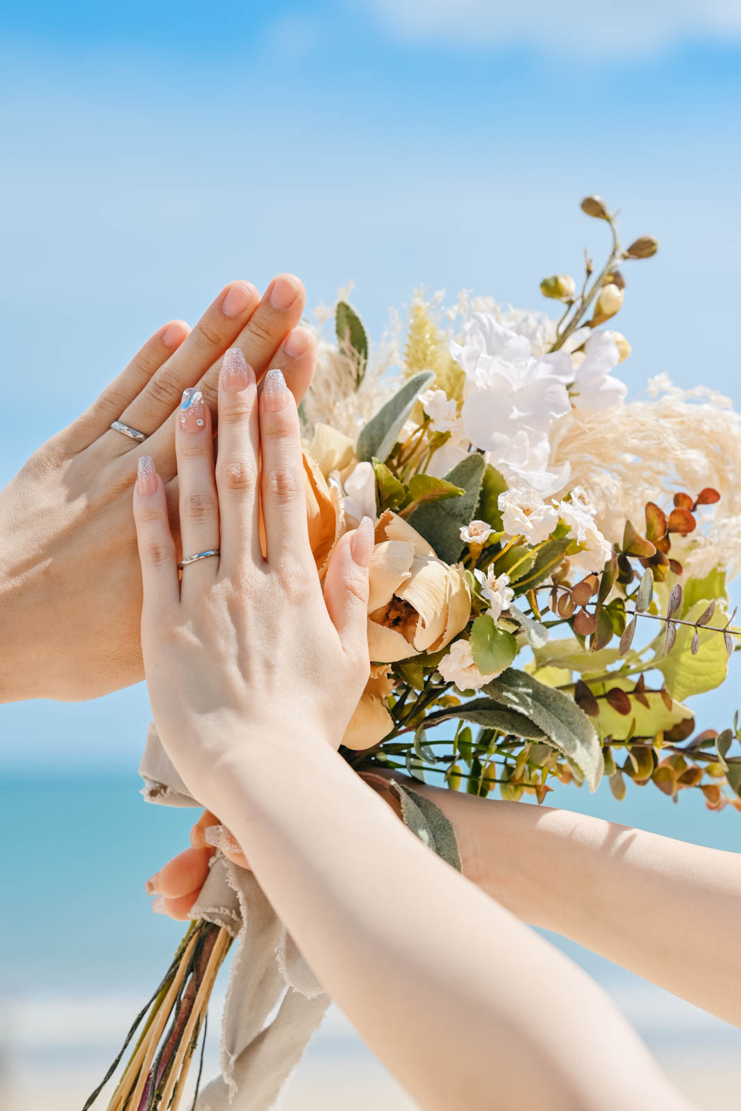 青い空や海へ伸ばした手に誓いのリングが光ります。お二人の希望あふれる未来を想像させる一枚ですね。ナチュラル感も素敵です。
