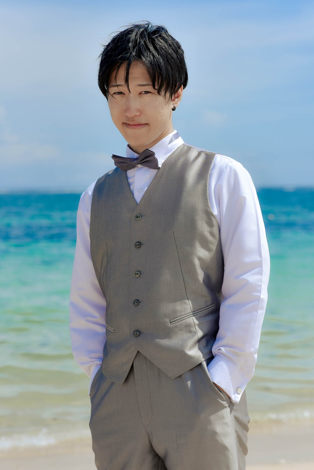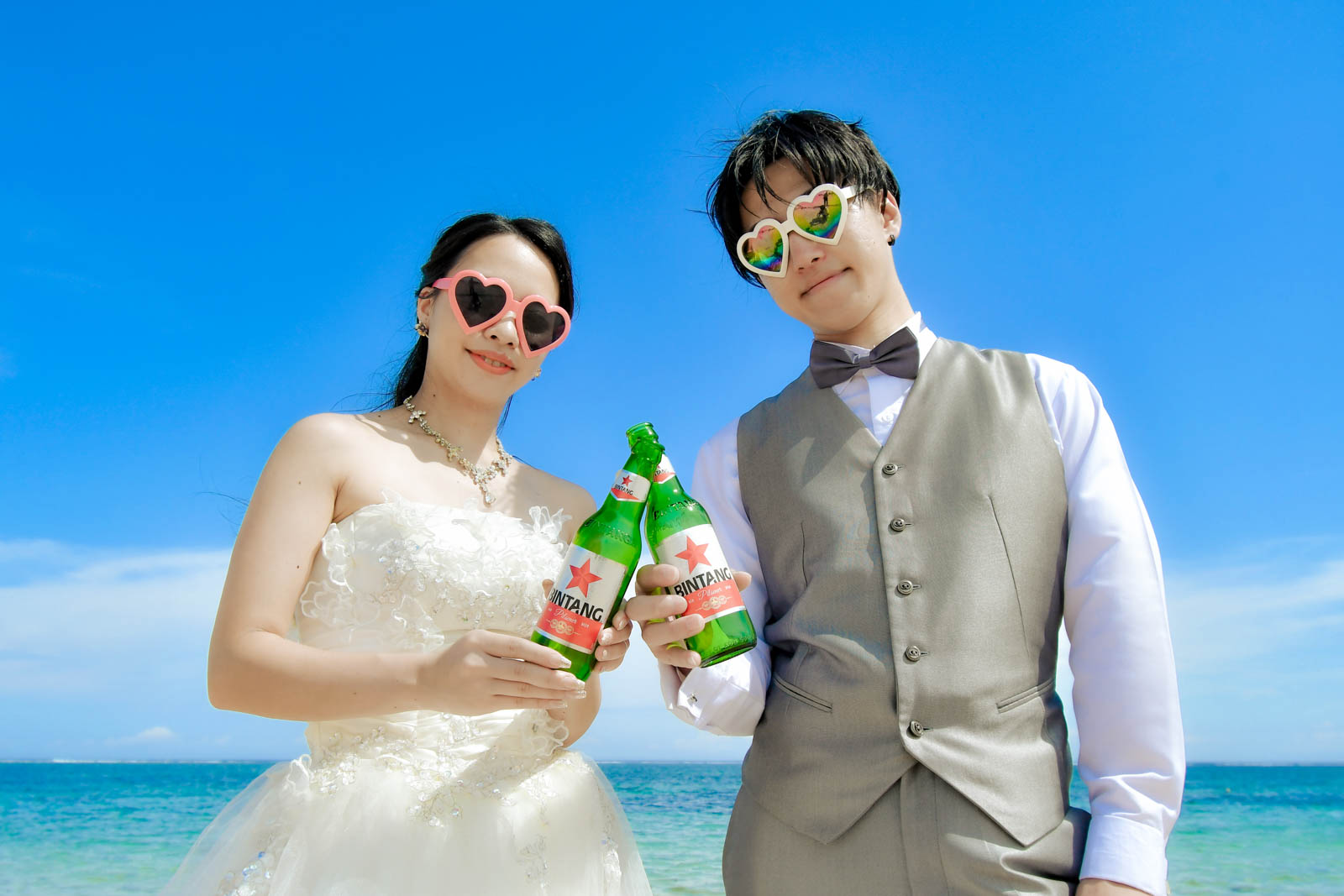 青く澄んだ海と真っ白な砂浜が広がる開放感あふれるロケーションで、ハート型サングラスや額縁を使った遊び心いっぱいの撮影も楽しみました。