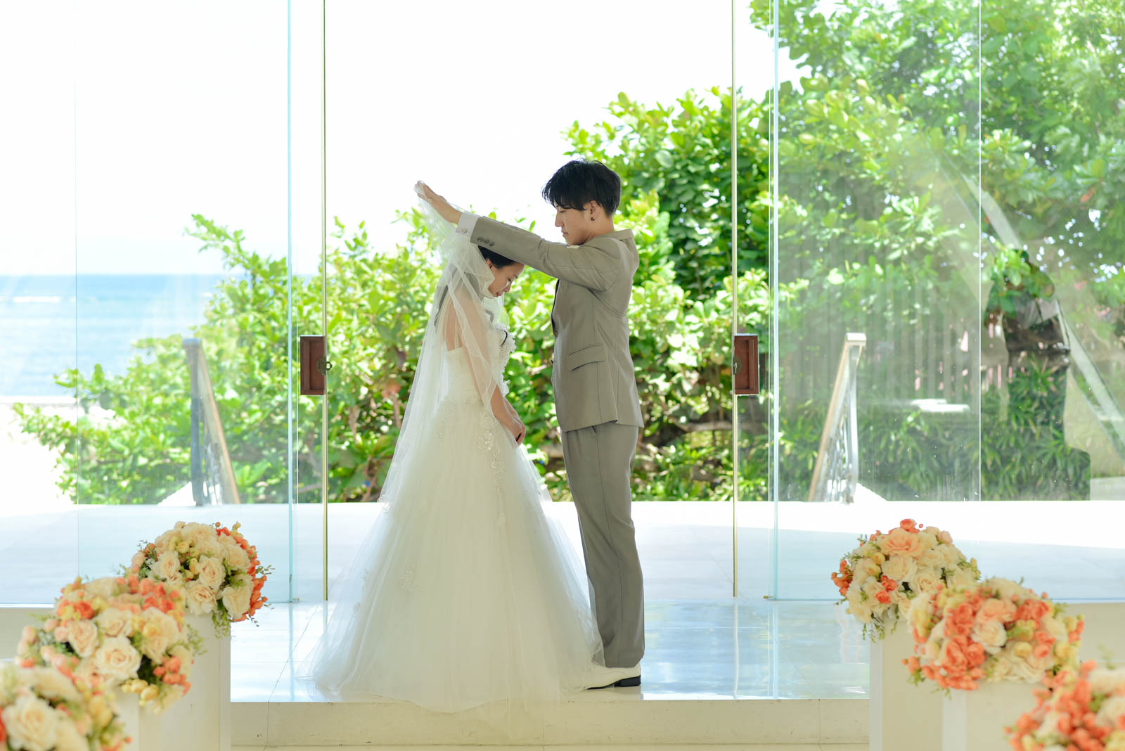 チャペル内では祭壇前や大きな窓を背景に、誓いを交わすようなシーンを撮影。ガラス越しに広がる海を背景にしたショットや、チャペル前階段でのフォーマルカットも映えます。