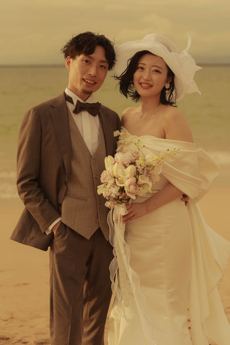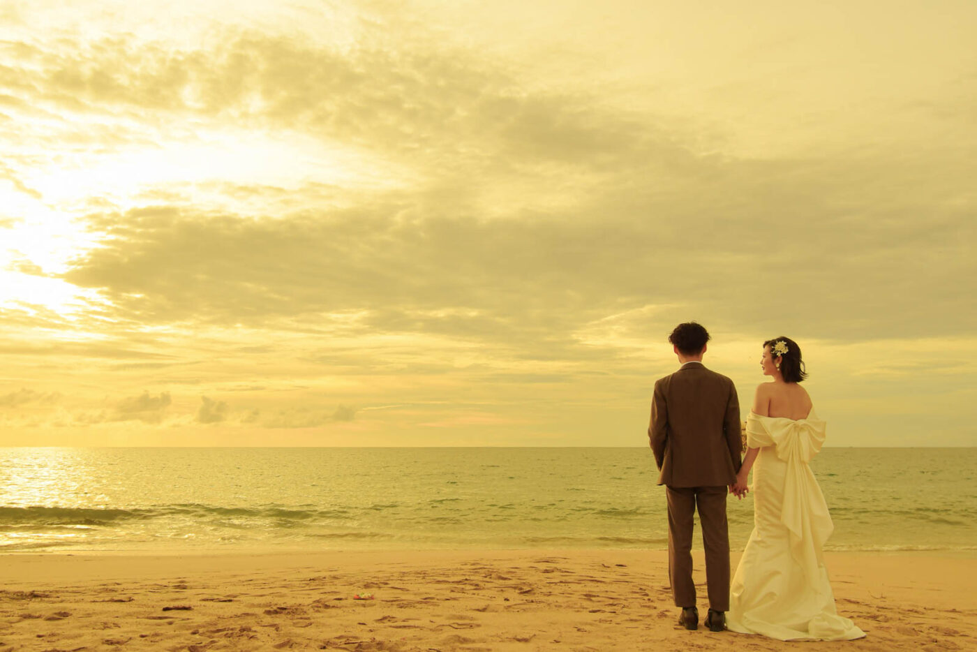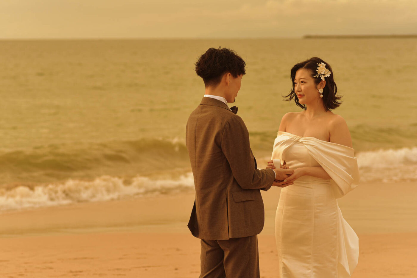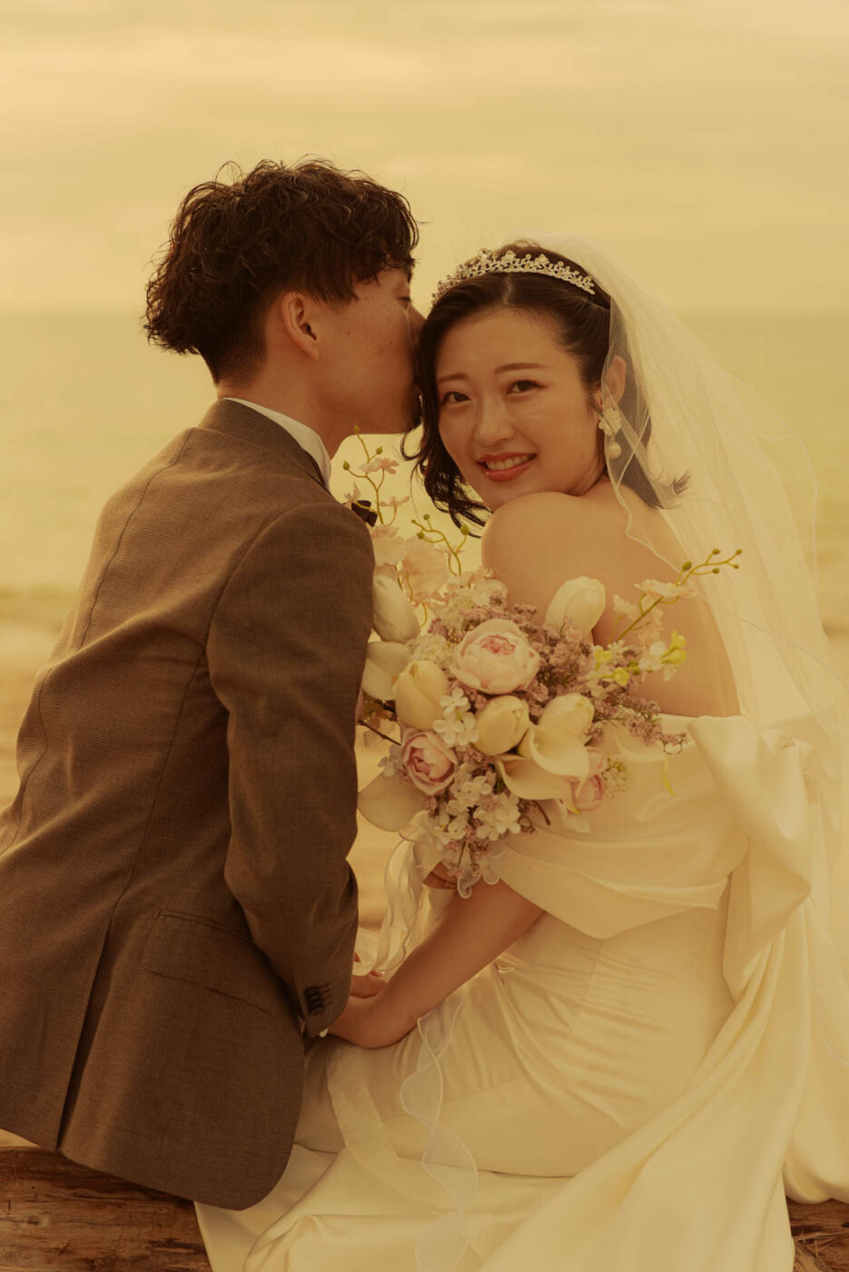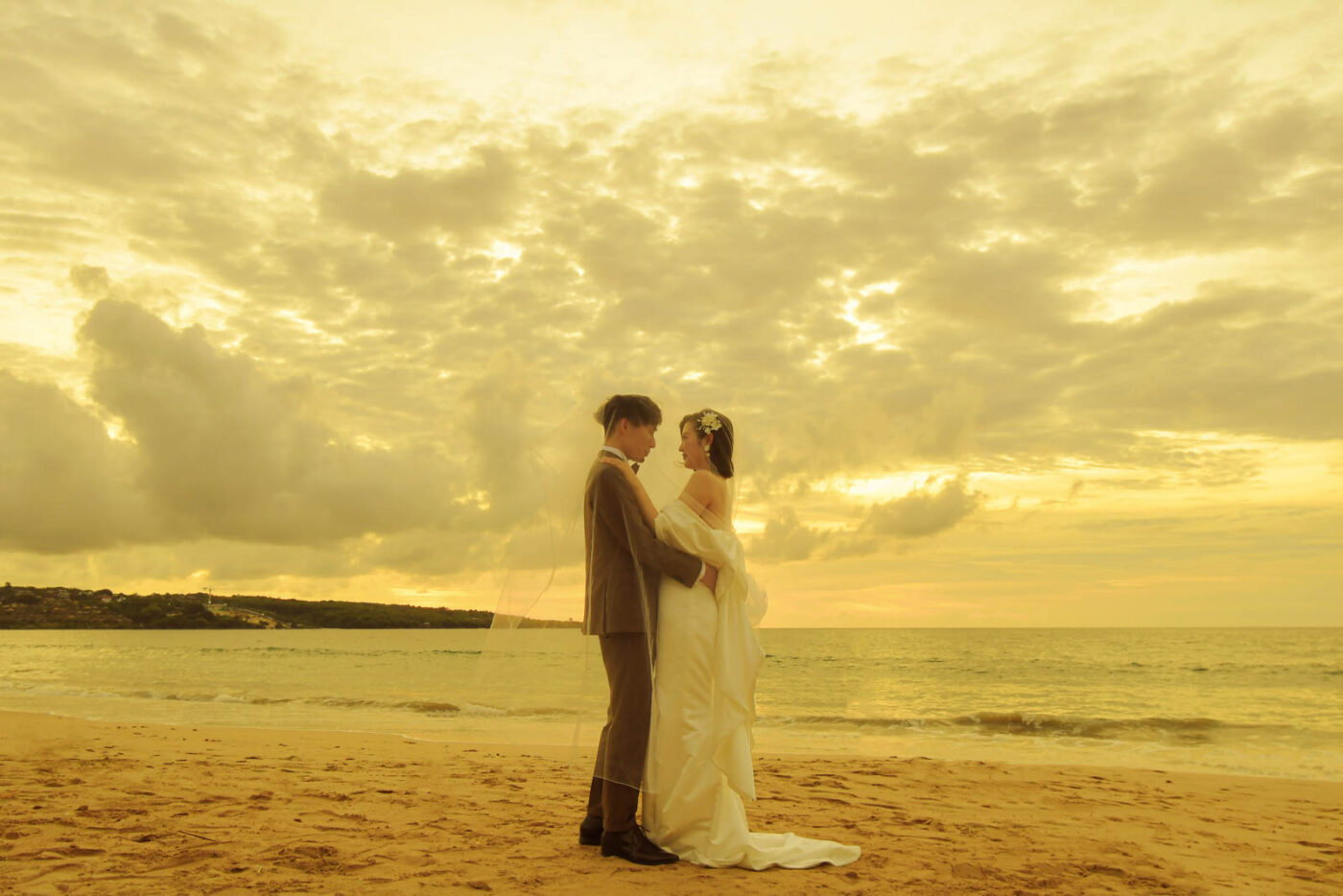 撮影の締めくくりは、バリ島のサンセットビーチ。黄金色に染まる海を背景に寄り添うおふたりの姿は、まさに「永遠の愛」を象徴する瞬間でした。