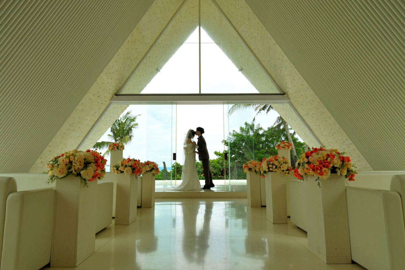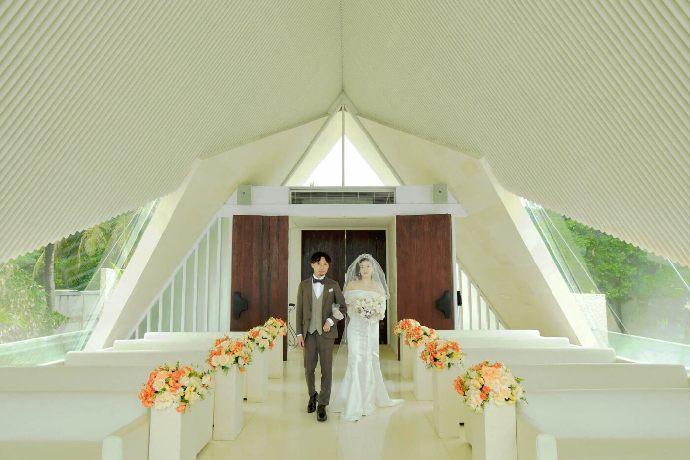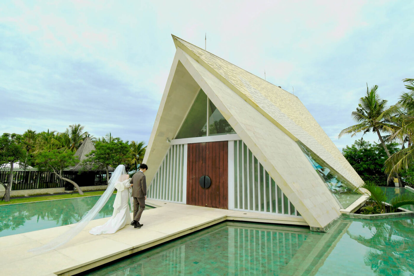 バリ島屈指の人気を誇る「ウルシャンティチャペル」。緑豊かなガーデンを進むおふたりの姿は、まるで映画のワンシーン。祭壇前ではやわらかな自然光に包まれ、指輪交換や誓いのシーンがドラマチックに切り取られました。