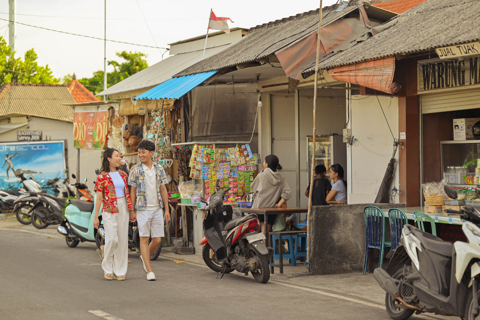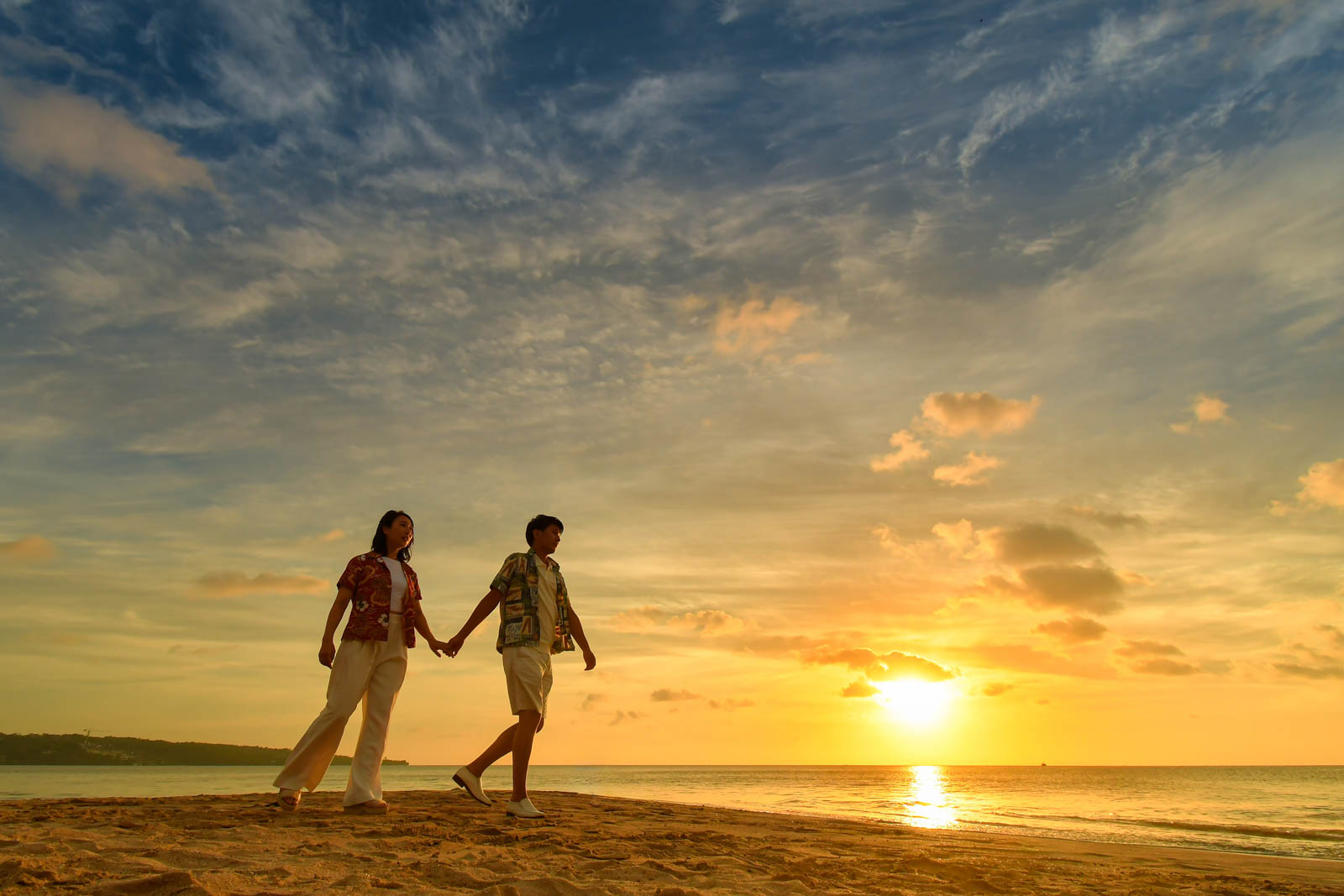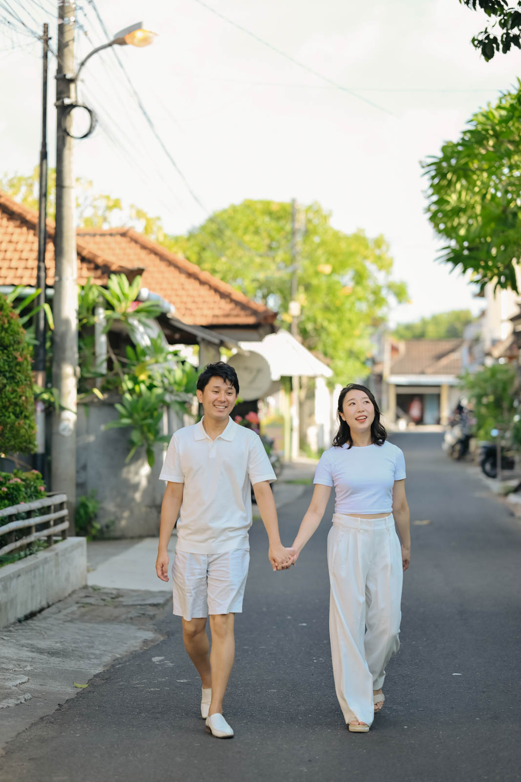 動きやすさとおしゃれさを両立させたコーディネートは、ビーチにも街並みにもぴったり。撮影中も終始リラックスした表情のおふたりが印象的でした。