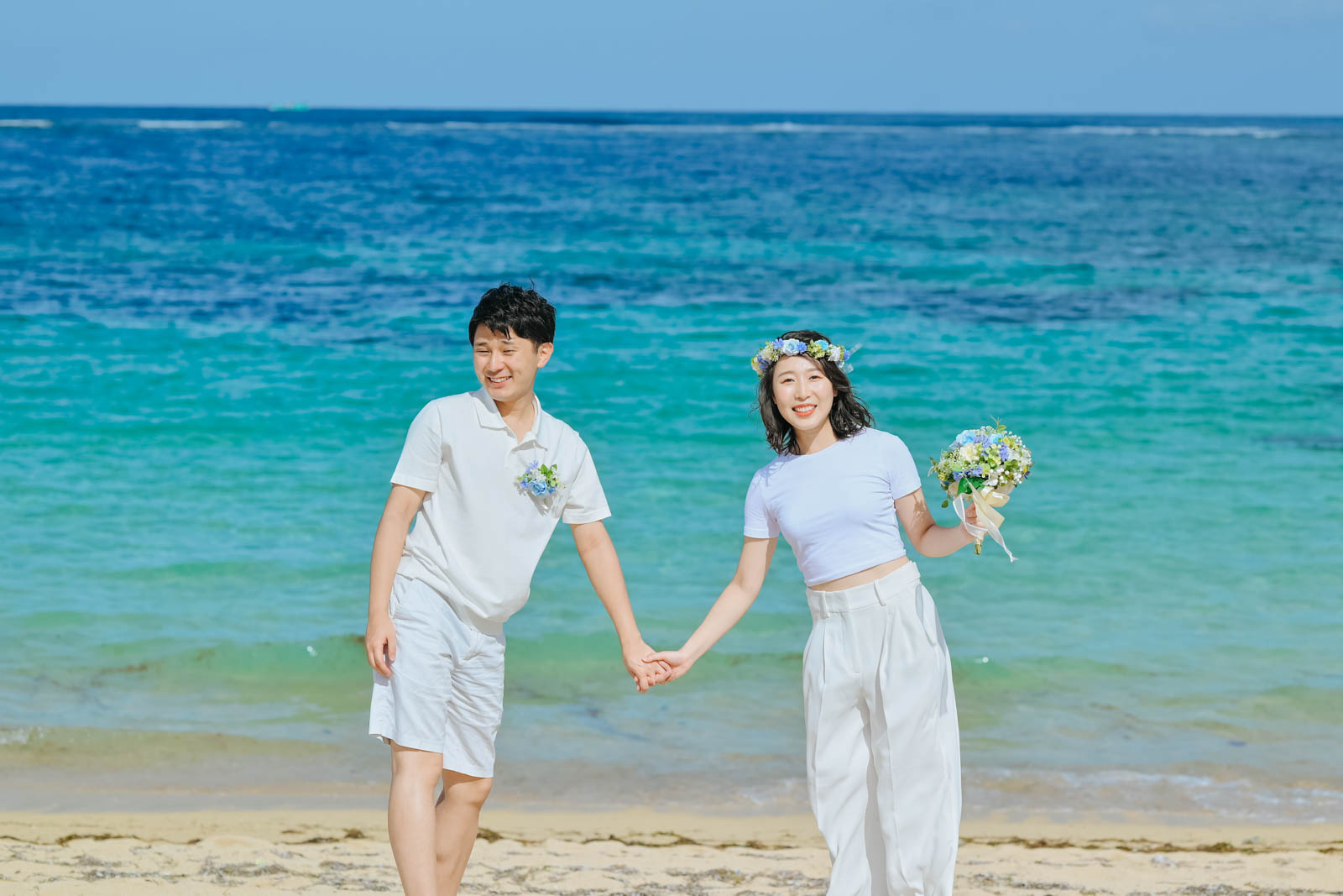 おふたりが選んだのは、私服での「リゾートカジュアル」スタイル。白を基調としたコーディネートに、花冠・ミニブーケ・ブートニアといったアイテムを日本からご持参いただき、ナチュラルながらも写真映えする装いに♡