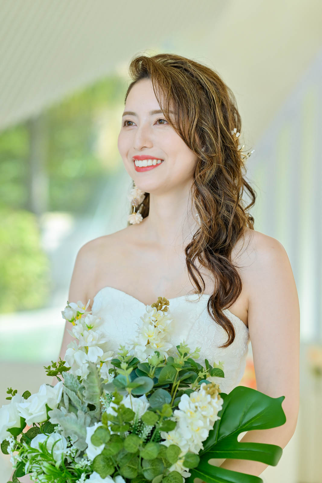 日本人スタイリストによるヘアスタイルは、ゆるめのハーフダウンスタイルに小花のヘッドドレスあしらい、ナチュラルメイクで。耳元ではフラワーモチーフのロングイヤリングが優しく揺れ、花嫁様の笑顔をより明るく引き立てます。
