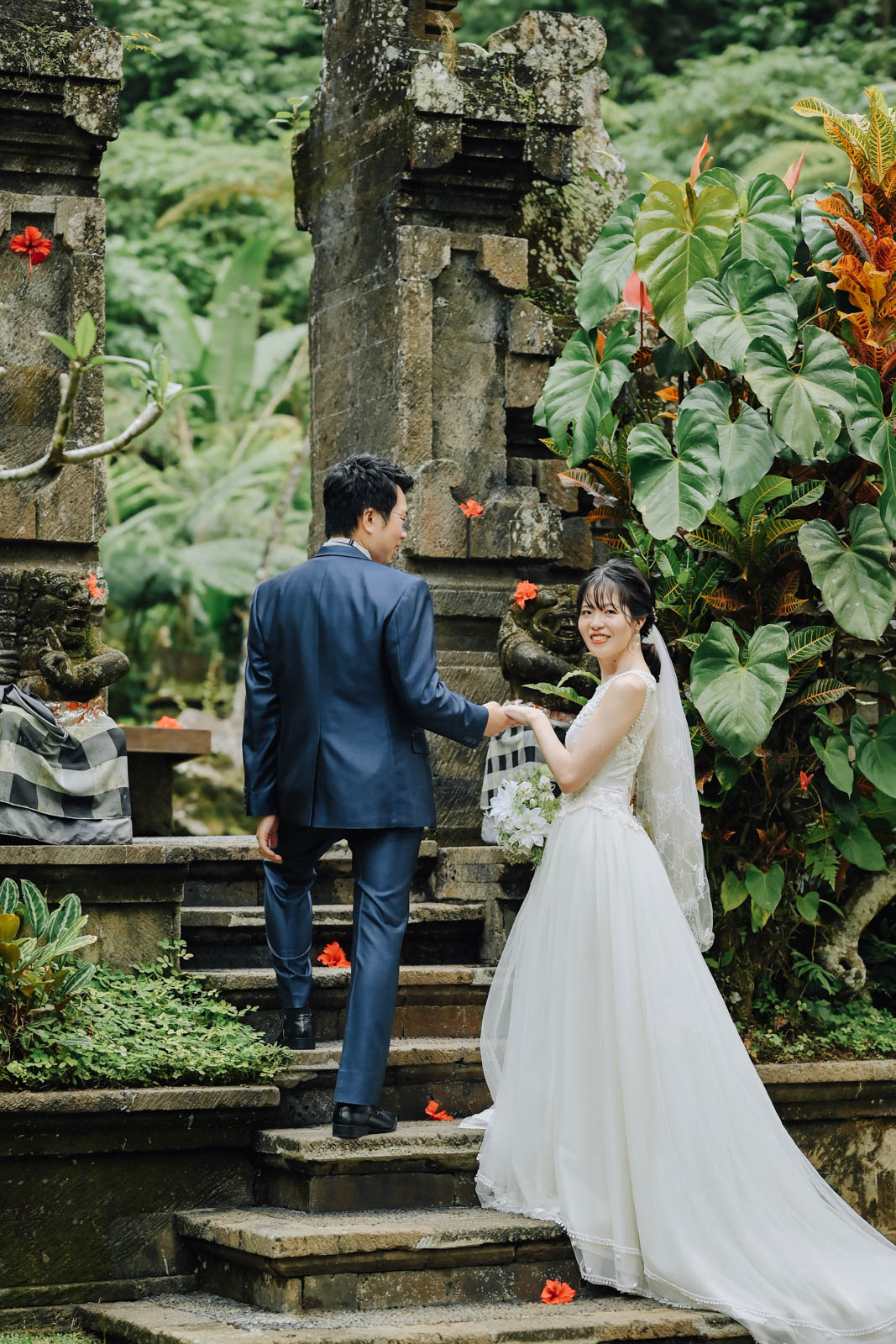 文化と自然が調和する街・ウブドを舞台に、T&A様のバリ島フォトウェディングを撮影しました。撮影を担当したのは日本語対応のアリン。ロケーションはウブドのカフェや街中、寺院と、渓谷に建つリゾート「ロイヤルピタマハ」での2ロケーション。朝から穏やかな晴天に恵まれ、柔らかな光が差し込むなかでの撮影となりました。