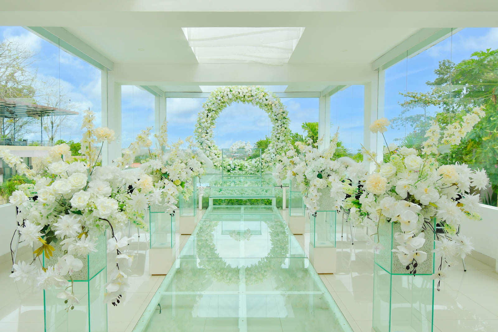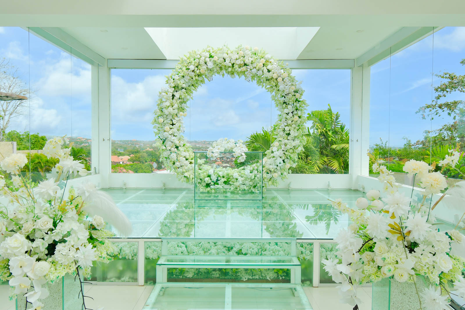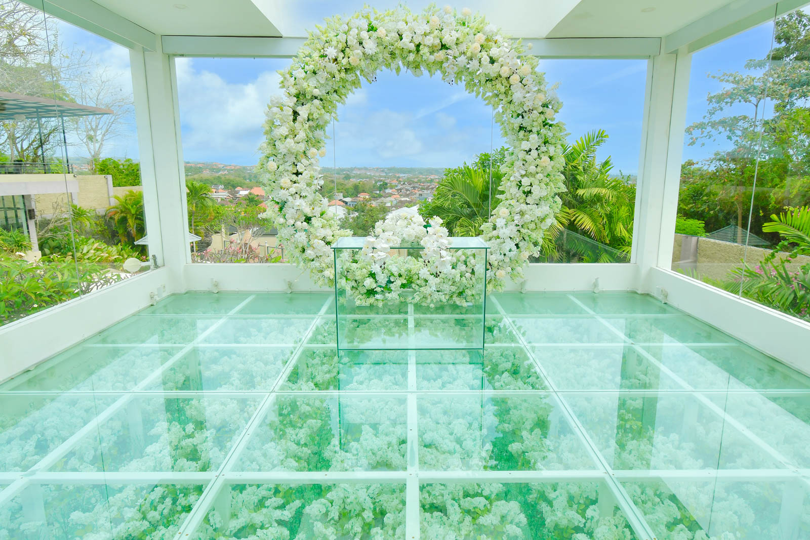 バリ島ジンバランの丘(Bukit)に佇む「ブキット・チャペル」は、ホテル併設のかわいらしいガラス張りチャペルです。白を基調とした建物は、全面ガラスから四方に光が差し込み、明るく開放的な雰囲気。バージンロードと祭壇もガラス張りで、神秘的な美しさを演出しています。全天候型なので、曇りや雨の日でも柔らかな光の中で美しいフォトウェディング写真が撮影できるのも安心ポイントです。