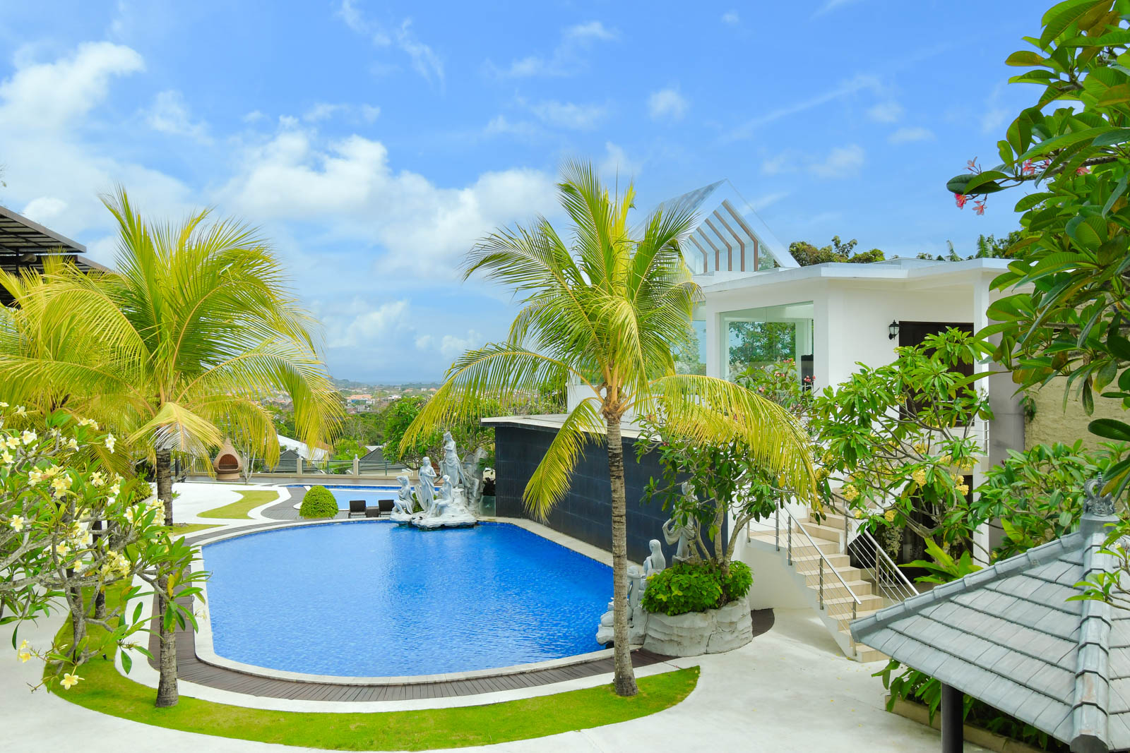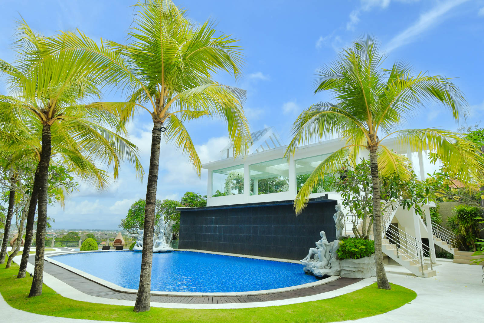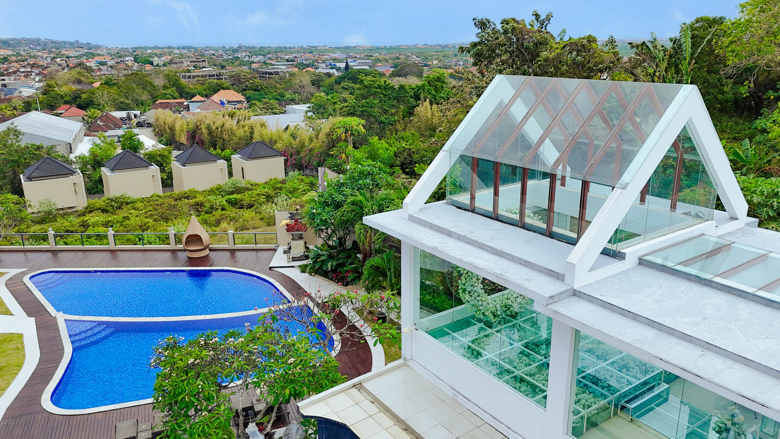 バリ島ジンバランの丘(Bukit)に佇む「ブキット・チャペル」は、ホテル併設のかわいらしいガラス張りチャペルです。白を基調とした建物は、全面ガラスから四方に光が差し込み、明るく開放的な雰囲気。バージンロードと祭壇もガラス張りで、神秘的な美しさを演出しています。全天候型なので、曇りや雨の日でも柔らかな光の中で美しいフォトウェディング写真が撮影できるのも安心ポイントです。