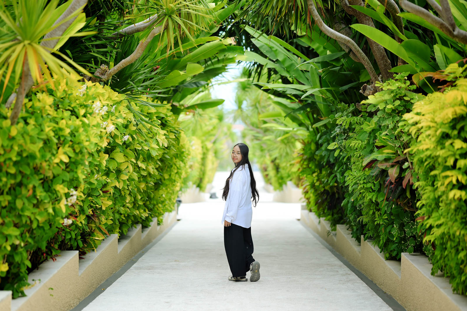 チャペルの周囲にはプールやヤシの木が広がり、南国リゾート感も満点。ガーデンやプールサイドでの撮影も可能で、チャペルへ向かう緑の小道もロマンチック。「写真だけの結婚式」にもぴったりのチャペルです。より結婚式らしくしたい方には、オプションで「牧師さまのお手配」ができます。
